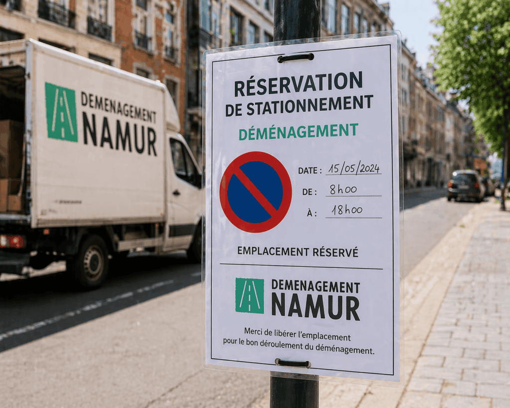 • Le conseil de l’expert : Vous devez réserver vos panneaux d’interdiction de stationner via le portail citoyen de la Ville de Namur. Si vous travaillez avec Déménagement Namur, nous pouvons vous guider sur le nombre de mètres nécessaires pour le camion et le déploiement sécurisé du lift.